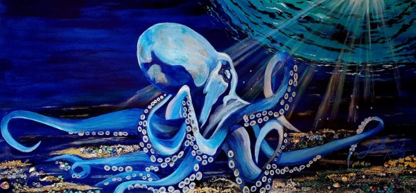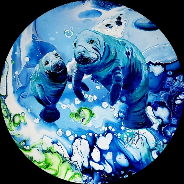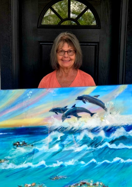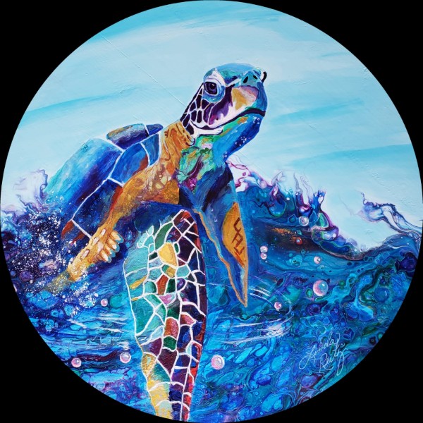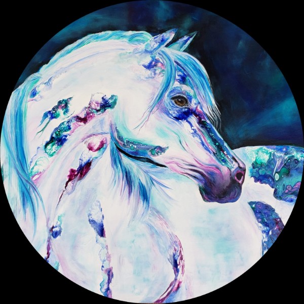 I build each piece through layered applications of paint, ink, and resin, creating depth and movement before finishing with a realistic subject in the foreground.