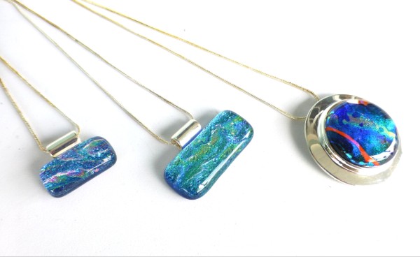 Deep tridimensional gems made of layed dychroic glasses, these pendants make us feel like we are looking at a miniature ocean!